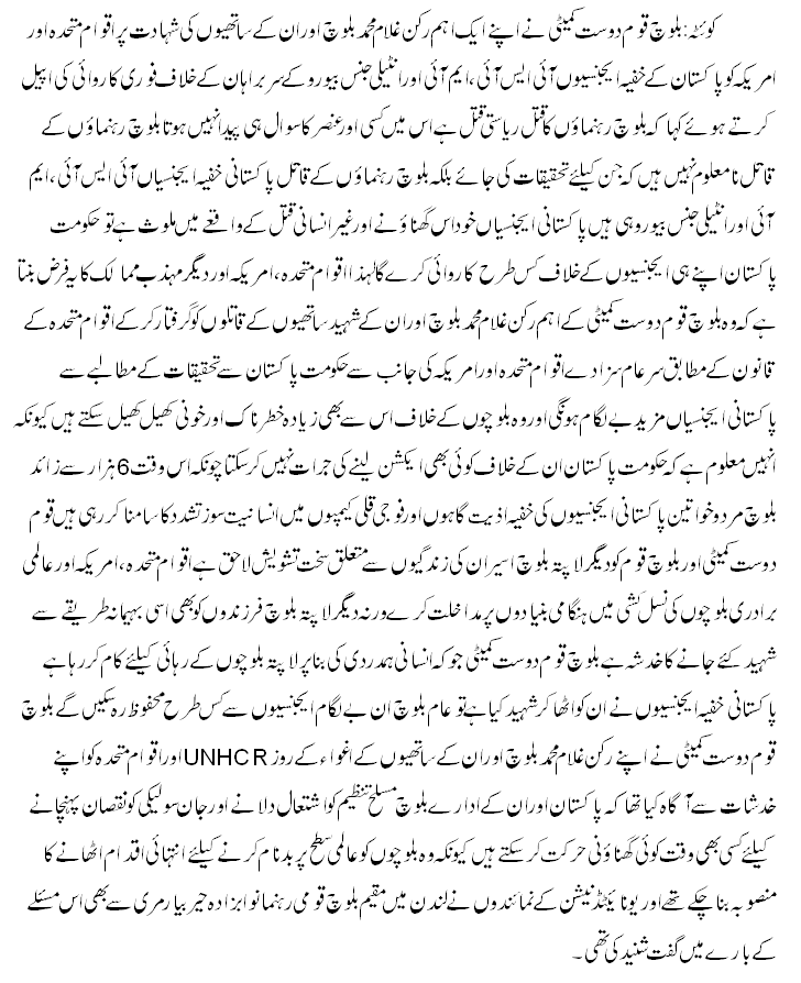 اقوام متحدہ، امریکا اور عالمی برادری بلوچوں کی نسل کشی میں ھنگامی بنیادوں پر مداخلت کرے۔ بلوچ قوم دوست پارٹی