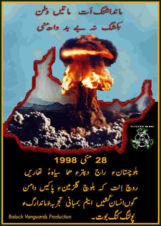occupied Baluchistan on May 28. The event will be held outside the Pakistan embassy in Washington DC, from 3 p.m. to 7 p.m. The exact address is 3517 International Ct. NW Washington DC. The metro station is Van Ness on the red line. A noon to dusk hunger strike will also be staged to draw the attention of the U.S. public to the ongoing brutal military operation in Baluchistan. Baluchistan, a Texas-size stateless region, is divided among Pakistan, Iran and Afghanistan and a bloody army operation continues there despite installing of a civilian regime in Pakistan. Pakistan's coup leader Gen. (R) Pervez Musharraf is still the president of the artificial state created by the British in 1947. Musharraf, like other army generals, is directly responsible for the Baluch genocide. Baluchistan was annexed by Pakistan in March 1948 and a move is afoot to knock the doors of the International Court of Justice. Last week three Baluch tribesmen were burnt alive in Pakistani-occupied Baluchistan. Several thousand people have been killed since the start of a bloody insurgency in 2005, which the Baluch call the Fifth War of Liberation against Pakistani occupation of their homeland since March 1948. The Baluch have risen in arms against the occupation of their country by Pakistan in 1948, 1958 and 1962 and 1973-77. The latest uprising started in 2005 and the dead include former governor and chief minister of Baluchistan, Nawab Akbar Khan Bugti, and member of the provincial assembly Mir Bala'ach Marri. More than 7000 people were jailed and tortured in Pakistan's gestapo-style prisons. Those jailed victims included former chief minister of Baluchistan, Sardar Akhtar Mengal. Though all nuclear weapons are equally condemnable, Pakistan's weapons of mass destruction is even more dangerous as it is religion-specific. As part of its state ideology, Pakistan considers people from other religions as its enemies and has made clear it will not desist from being the first to use nuclear weapons. Islamic fundamentalists took to the streets of Pakistan when the nuclear weapons were tested in Chagai 10 years ago. They had missile replicas mounted on trucks with "United States" inscribed on them A number of U.S.-based Baluch human rights activists will participate in the protest rally in DC. American guitarists will sing peace songs, while U.S. poets will recite poems. Speeches by Baluch and Sindhi activists will deal with the situation faced by the people of Baluchistan and Sindh. Similar protests are planned in Pakistan and other Western capitals, including Toronto and Oslo. The event in DC has been organized by the Baloch Society of North America and the American Friends of Baluchistan |