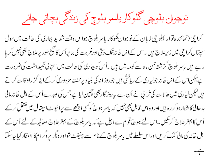 نوجوان بلوچی گلوکار یاسر بلوچ کی زندگی بچائی جائے